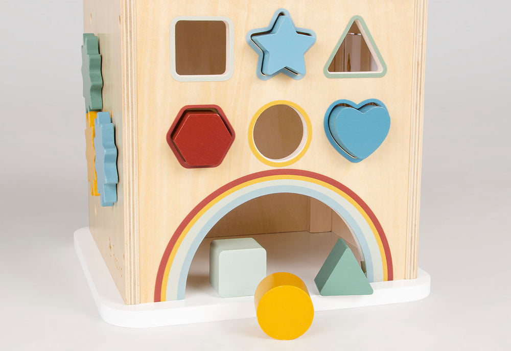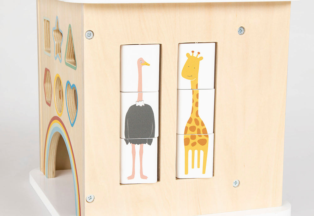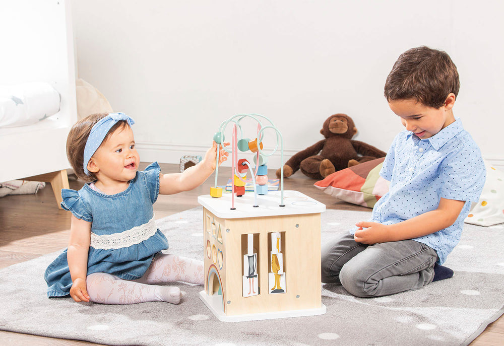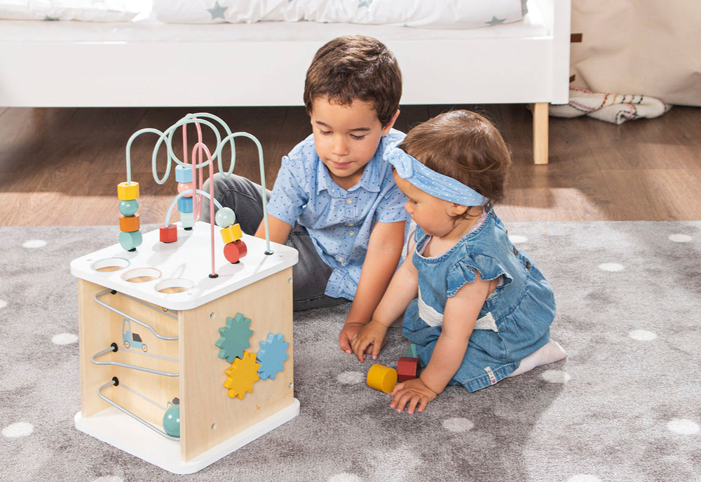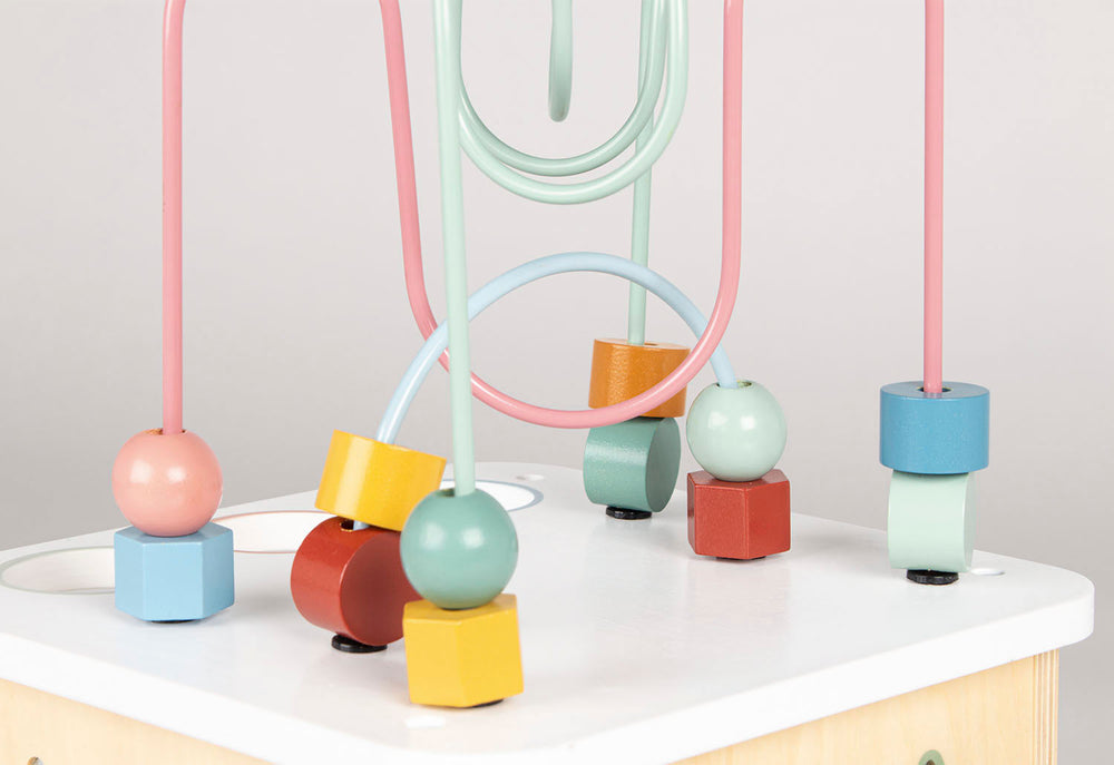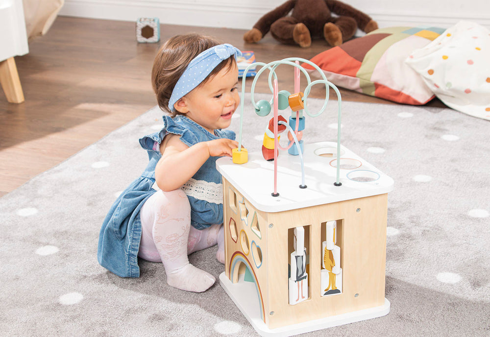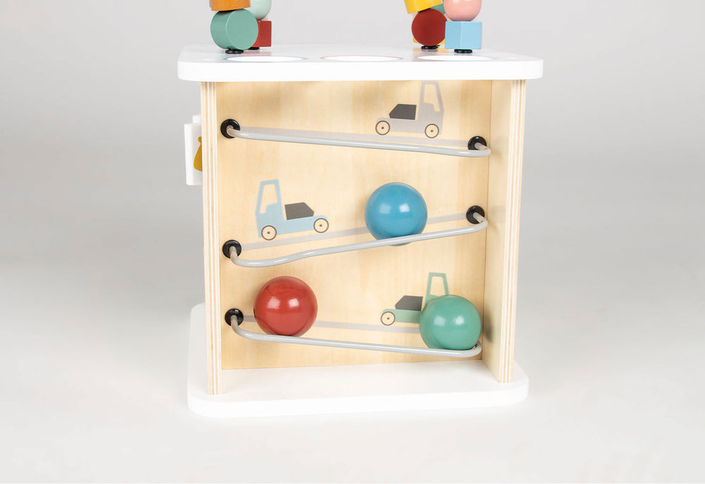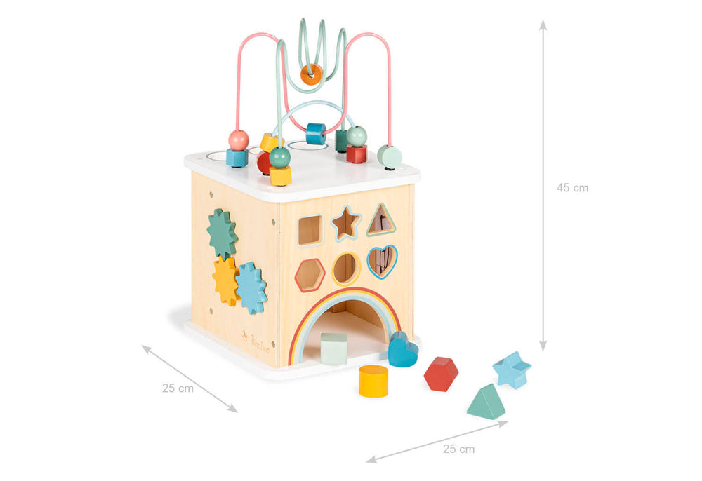 • 10 pièces : 1 cube de motricité, 3 balles (Ø 46 mm), 6 blocs enfichables