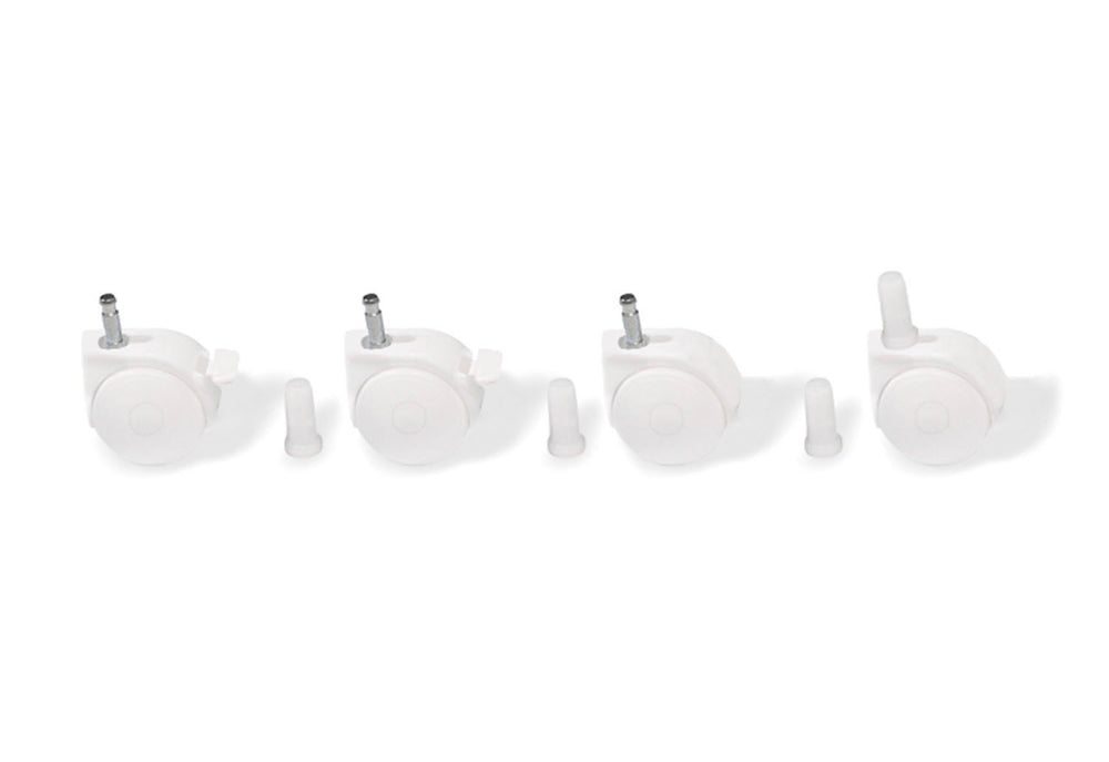 • 4 roulettes pivotantes blanches, dont 2 avec fonction frein